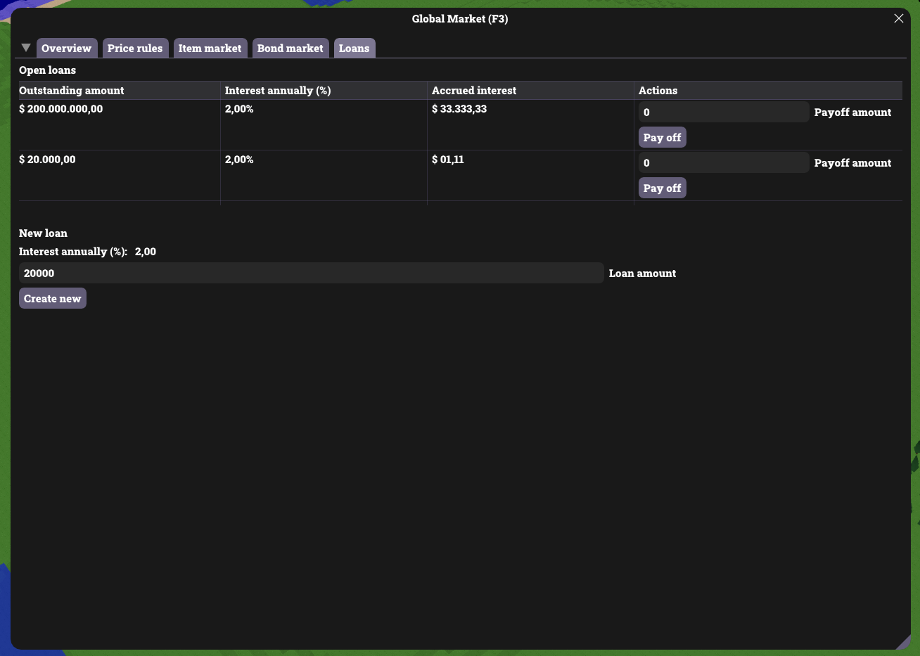 Incorporating a way to lend money has proven to be a valuable enhancement to the game. It adds flexibility for players to take on higher-risk ventures and creates interesting dynamics as the in-game world and markets evolve. The tension between managing debt and capitalizing on opportunities should provide an engaging challenge, regardless of playstyle.